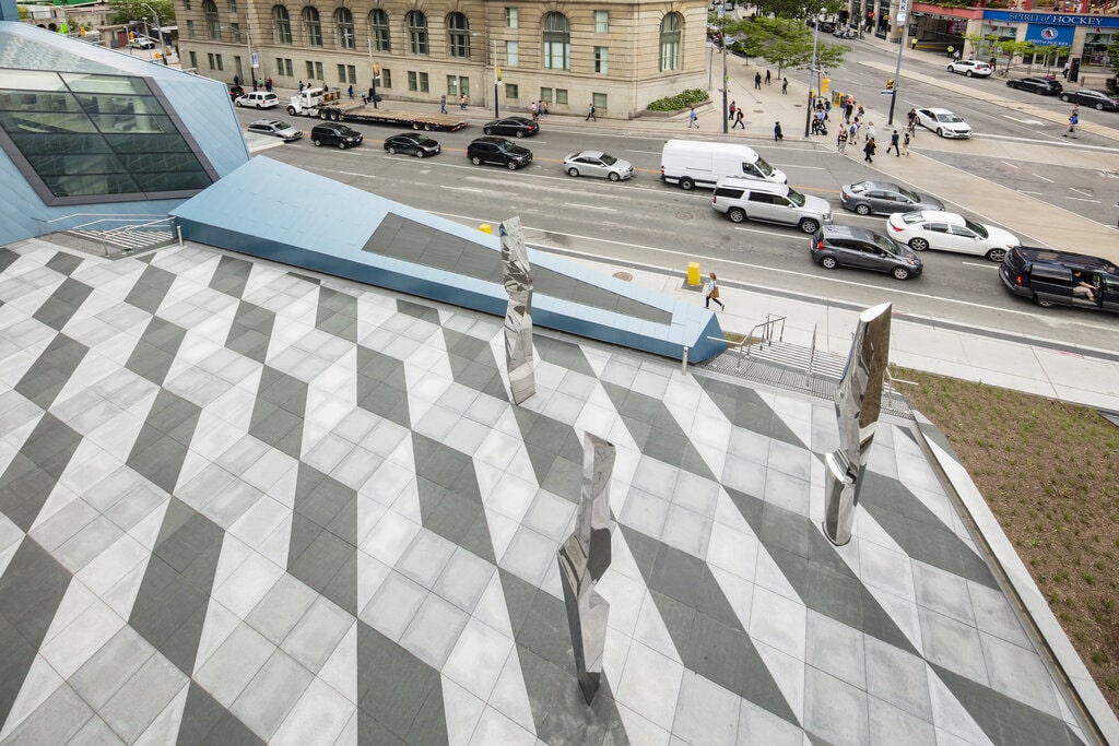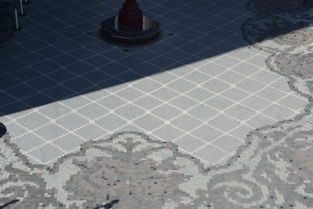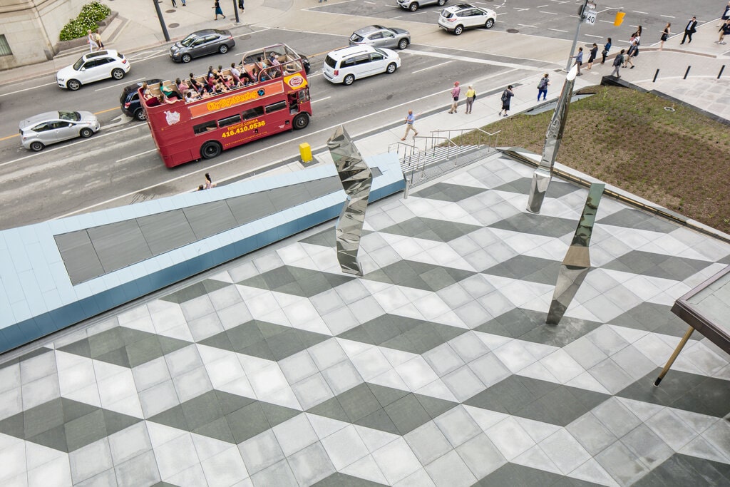 As you can see from the images, the plaza’s surface is paved with an angled checkerboard pattern in black and white granite that responds to the acute angles of the theatre and nearby streets.